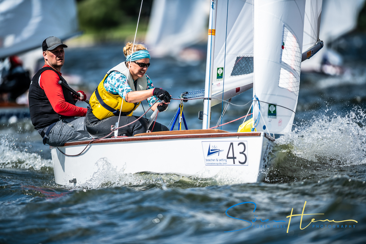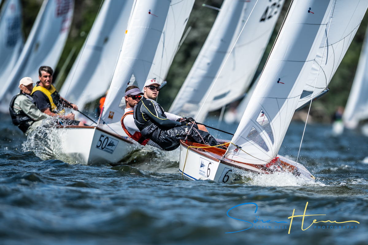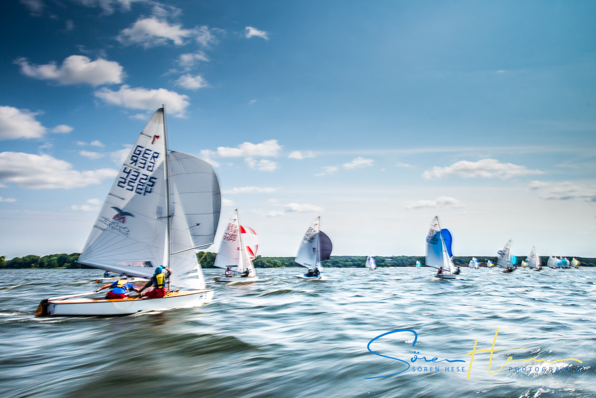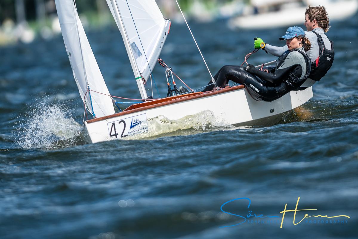 Völlig atypisch gibt es zur IDM der Piraten einige Tage mit richtig … also richtig, richtig guten windigen Bedingungen im Juli bei fast durchgängig um 30 Grad. Da spürte man die 4-6 Bf kaum – ein heißer Wind, der für viel Spass auf der Regattabahn sorgte. Hier und da spontane Juchtzer inklusive. Nur der Dienstag war wohl etwas schwachwindig. Das machte Laune – da will man doch glatt auch wieder einen Piraten segeln. Bei mir ist das alles ewig her – meine ersten Segelkurse im Pirat an der FU Berlin – das war der Start in meine Regatta-Zeit Mitte der 90iger Jahre. Der Pirat ist immer noch ein tolles Jugendboot und fährt am Wind wie ein Starboot – bei gutem Gewichtstrim sieht man regelrecht wie relaxt das Boot durch die Welle pendelt. Zur IDM hat einfach alles gepasst. Kann man nicht von allen Regatten im Berliner Sommer sagen, aber hier kam wohl alles zusammen. West Wind 4-6Bf – soundso mit NW zusammen die beste Windlage, da dann die ganze Gr. Breite genutzt werden kann und sich der Wind nicht so turbulent zeigt wie bei Ostwindlage und dazu ordentlich warm, nur einige Matten aus Schlingpflanzen machten Ärger – hier und da musst man drum herum fahren – hab ich so auch bisher noch nicht erlebt im Sommer hier. 52 Boote und freie Bahn auf einer völlig leer gefegten Havel. Die Highlights einzufangen war da nicht sooo schwer. Ist aber immer ein Balanceakt dicht genug aber nicht zu dicht dran zu sein. Vielen Dank wiedermal an den VSaW für den VSR Torqueedo Renner – auf den Seen hier das perfekte Schlauchi für die Shootings, super präzise Ansprache, keine Abgase bei Luvstellung des Motors und kaum Hecklastig der Renner. Es ist recht viel Bild-Material entstanden.